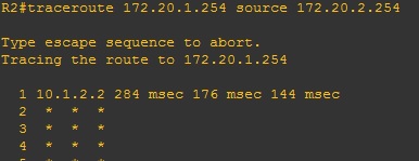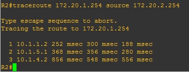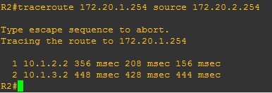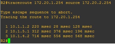 Ta nhận thấy R2 đã chuyển route qua luồng 2 nhưng lại rớt. Nguyên nhân là do trên R3 vẫn vẫn giữ route qua luồng 1 và không phản hồi lại cho R3 Chúng ta thử shut f0/0 trên R3, và tiến hành tracert từ R2 lại.